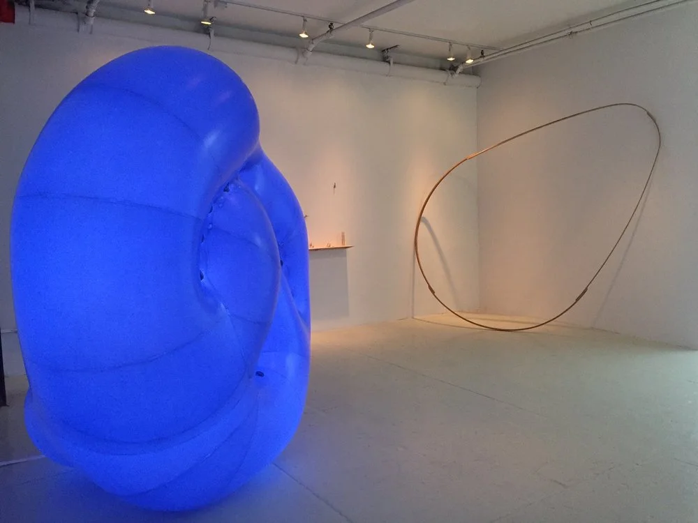 Daniel G. Hill’s 3-dimensional wire drawings hang elegantly off the wall. The drawings have a flexible quality because of their constructional detail and engage in a contrary play with gravitational pull. Harry Leigh’s thin, bent wood constructions are simple geometric shapes that sometimes lean or hang on the wall. Proportioned to a human bodies’ reach, these works with their open structures silently command the space they occupy. By contrast, Doreen McCarthy’s biomorphic sculpture is a playful mass of inflated vinyl that glows from within (via LED lights). It is as if the air inside emits its own light, allowing the work to rest buoyantly in space. Small in scale, Liz Sweibel's sculptures use scraps of wood that are stripped to their bare essence and draw us into a world of minute details.